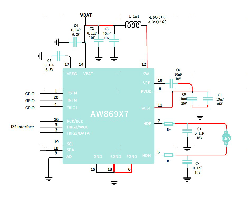 AW869X7FCR系列是支持I²S/I²C控制方式的高压11V线性马达驱动,其内置12KB SRAM,自带F0检测和F0自动追踪&刹车功能,支持最高4K FIFO播放。同时,其还支持多模式播放方式(RAM Mode、RTP Mode、 CONT Mode、I2S Mode)、波形自定义输出,具备高精度负载阻抗检测和过流、过温、欠压保护等功能,可带来高品质的振感体验。