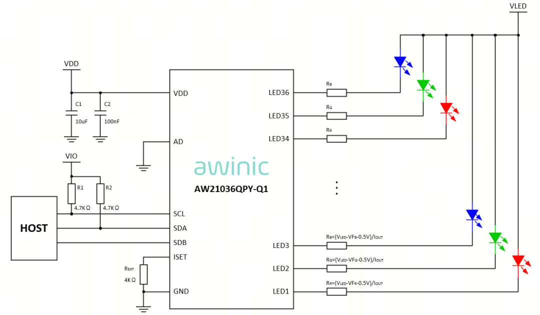 艾为AW21036QPY-Q1是一款车规级LED驱动芯片(【新闻】艾为电子LED驱动芯片通过AEC-Q100认证 艾为灯语®添车规级新成员),采用PWM控制恒流源电路的设计方式,既保留了PWM调光精度高的特点,又兼顾恒流源的优势,可以采用配置寄存器的方式实现恒流源驱动LED。