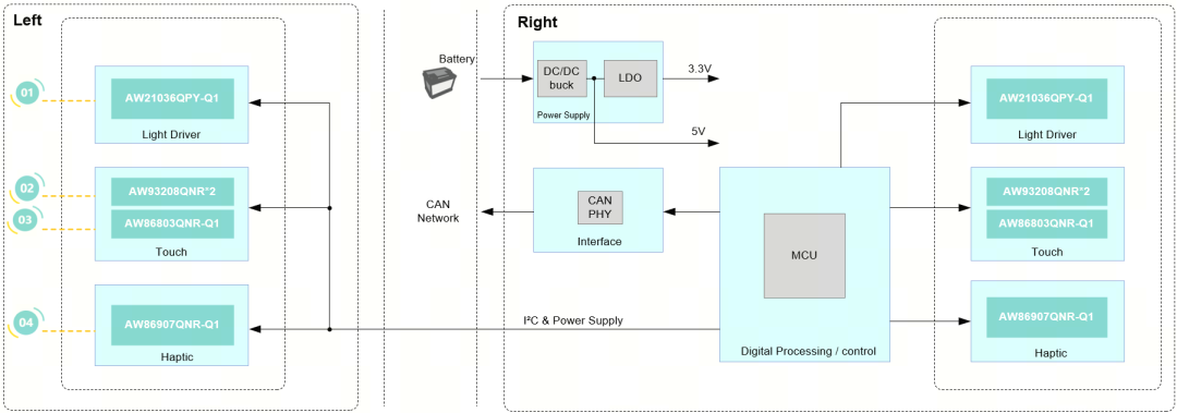 在方向盘智能交互方面,艾为通过持续不断的自主研发,也带来了相应的解决方案。艾为方向盘智能交互解决方案主要包括两个方面——智能表面解决方案与LED驱动方案。可覆盖以下几种功能需求: