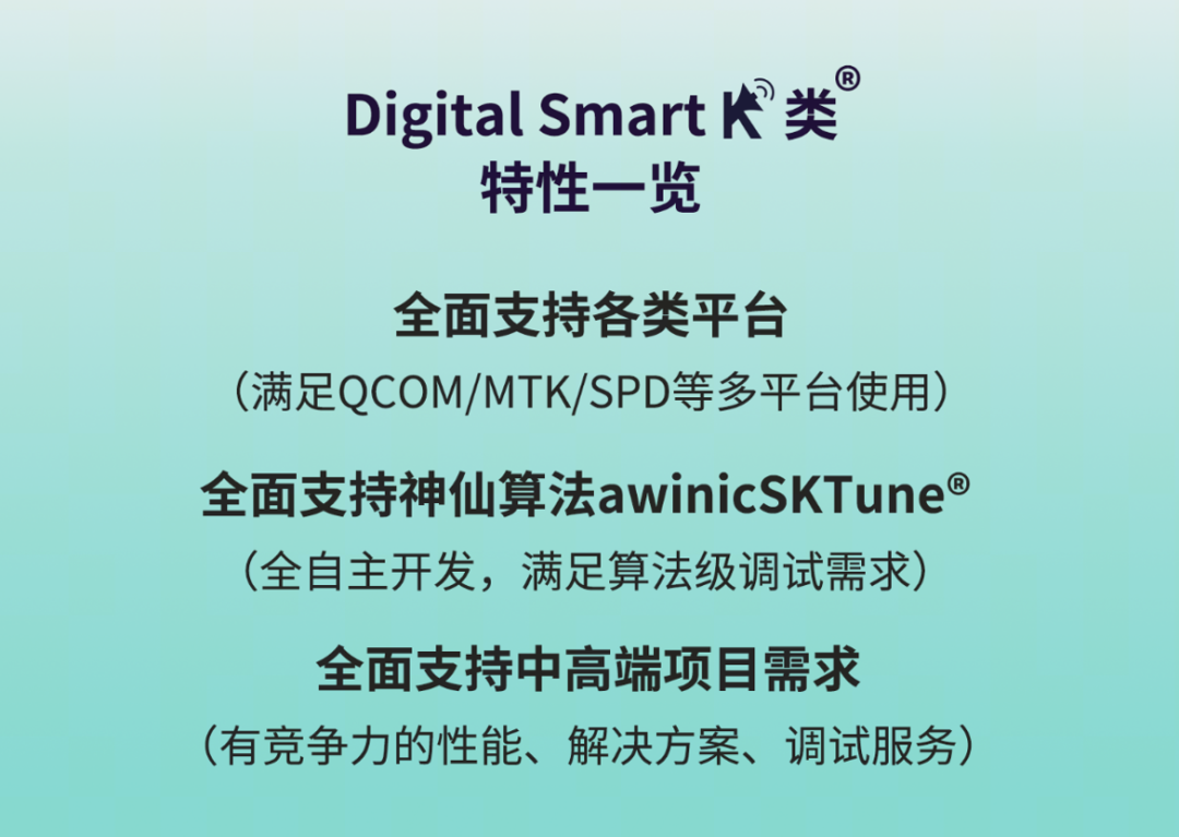 和荣耀一样,艾为在追求音质极致体验的道路上也从未停止过探索创新的脚步。新一代“神仙算法”awinicSKTune®V6拥有虚拟低频(VB)、语音增强(SVM)、AI声场环绕(ASS)、AI齿音自动抑制(ASR)、自动清晰度控制(ASC)等多种创新特色,使用户轻松坠入澎湃的音乐海洋中。
