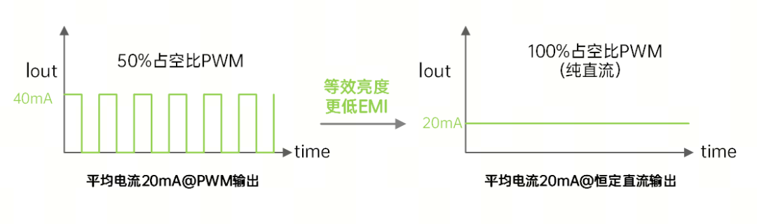 AW21036QPY-Q1支持256级直流电流调节+256级PWM调节。对于车载指示灯等应用,256级直流电流足够满足需求,因此可以将PWM占空比设置为100%,从而消除了PWM引入的EMI干扰。