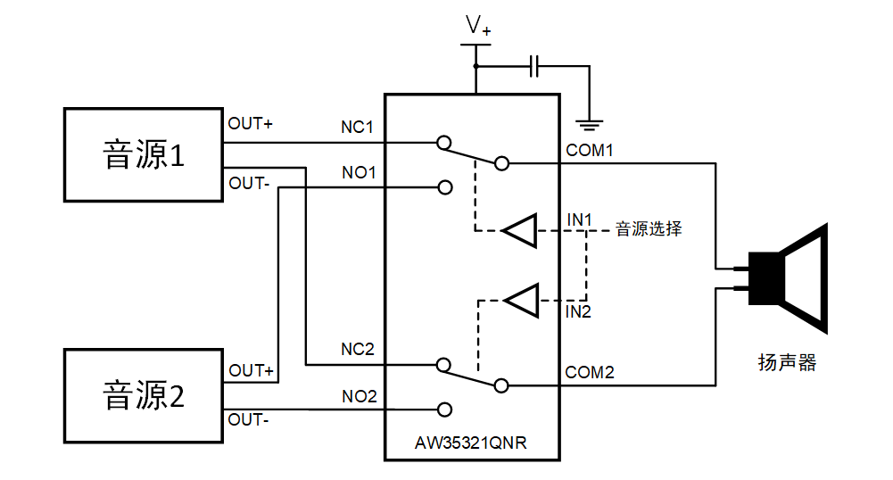 这一过程不仅增加了物料成本,给系统设计提高了复杂度,还带来了一些不必要的麻烦。在交流耦合系统中,从一个音源切换到另一个音源时,电容充电瞬间,扬声器上会出现电流尖峰,从而出现“POP”噪声。而负摆幅模拟开关因为不需要交流耦合电容,因此可以显著减少此类“POP”噪声现象。AW35321QNR采用单电源供电,支持负摆幅,配合负摆幅音频功率放大器可以实现多个扬声器共享音源或将多个音源路由至扬声器。不仅如此,采用AW35321QNR的方案设计将会更加简洁,物料成本更低。