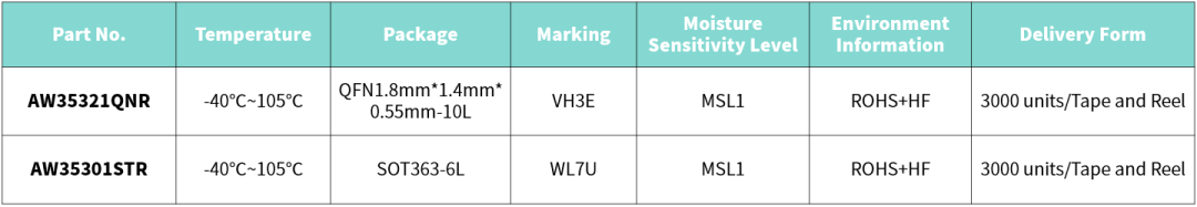 AW35321QNR采用绿色环保的小体积QFN 1.8mm * 1.4mm * 0.55mm – 10L封装。该封装占板面积小,非常适用于手机、PAD、超薄本等内部空间紧凑的电子设备。