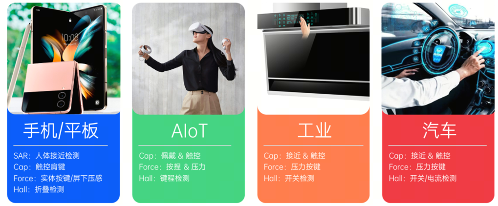 其中Force Sensor与Cap Sensor具有无需开孔、灵敏度高、经济耐用等优势,赋能AIoT新型的交互方式,广泛应用于AR、VR、TWS的触控和佩戴检测,在智能头盔、工业电梯、智能家电、新能源汽车等领域也被广泛使用。
