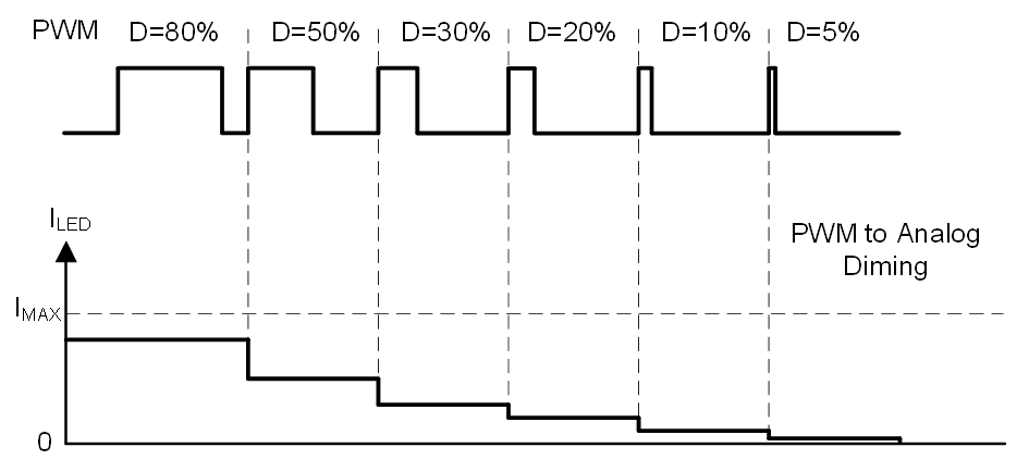 为了适配不同环境光下补光灯亮度需求以及手电筒模式不同亮度调节的应用场景,AW36501DNR在Flash模式和Movie/Torch模式下均可以支持PWM转模拟调光方式,通过改变ENM占空比灵活调节输出电流,不受固定档位的限制,实现更细腻的调光效果。AW36501DNR可以支持15k~200k宽泛的调光频率,可以满足不同平台需求。