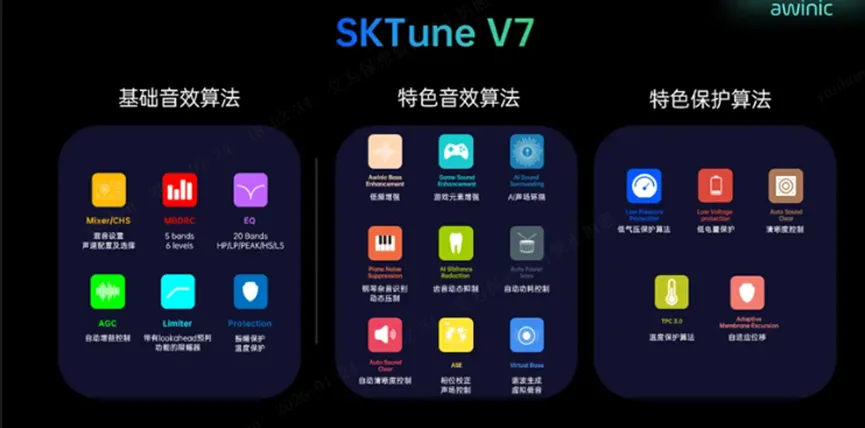 神仙算法awinic SKTune®从V1发展到V7,始终从客户需求出发,匠心打磨,不断突破技术瓶颈,从基础音效算法到特色音效算法,从硬件保护机制到特色保护算法,为上亿手机用户带来高级的听觉享受。