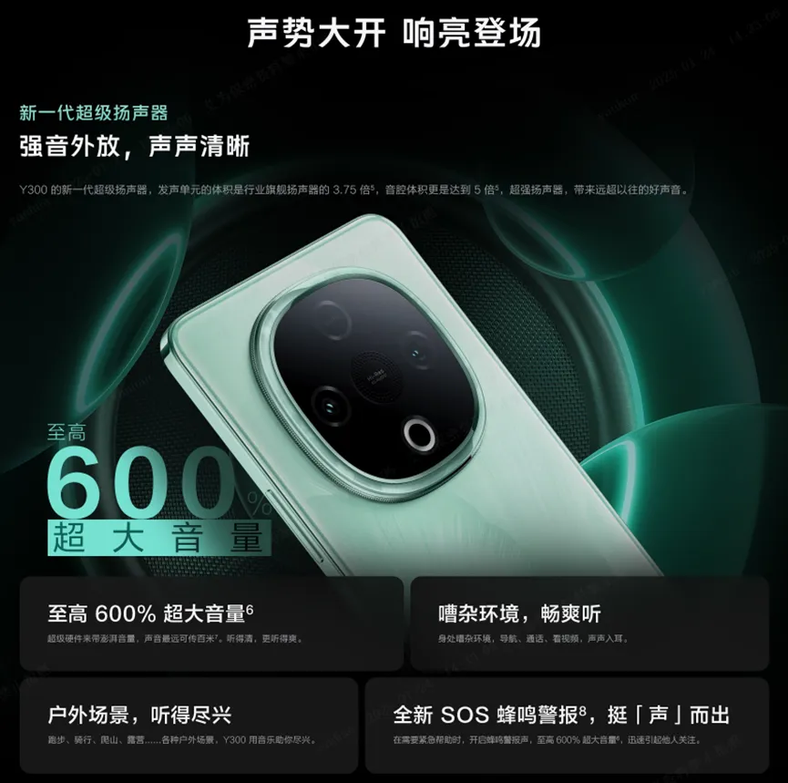 vivo Y300上搭载了vivo史上最响扬声器,带来至高600%超大音量,最大声压级可达91.7dB,最大音量下声音最远可传至100米,震撼、响亮的外放声音可以在多种场景下,让用户听得清也听得爽。在超大发声单元的基础上,vivo还设计了4cc的专业声学腔体,超大腔体可以使空气振动得更充分,让Y300的外放声音具有超强“爆发力”,同时扬声器矩阵的峰值功率达到了4.5W,约是前代Y200的3倍。