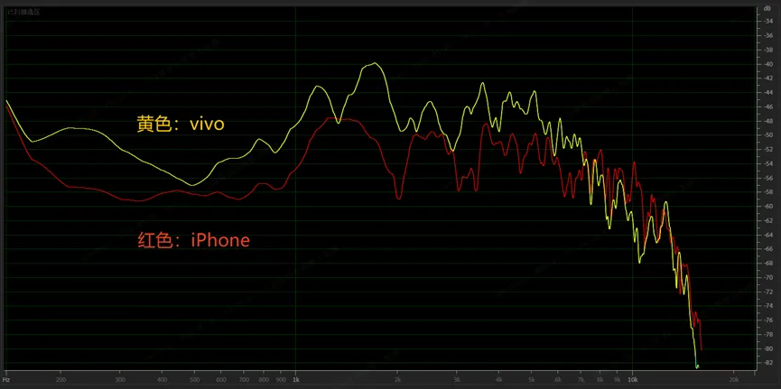 图3 vivo Y300 VS iPhone15 Pro max外放频响曲线对比,中低频响度最高提升8dB