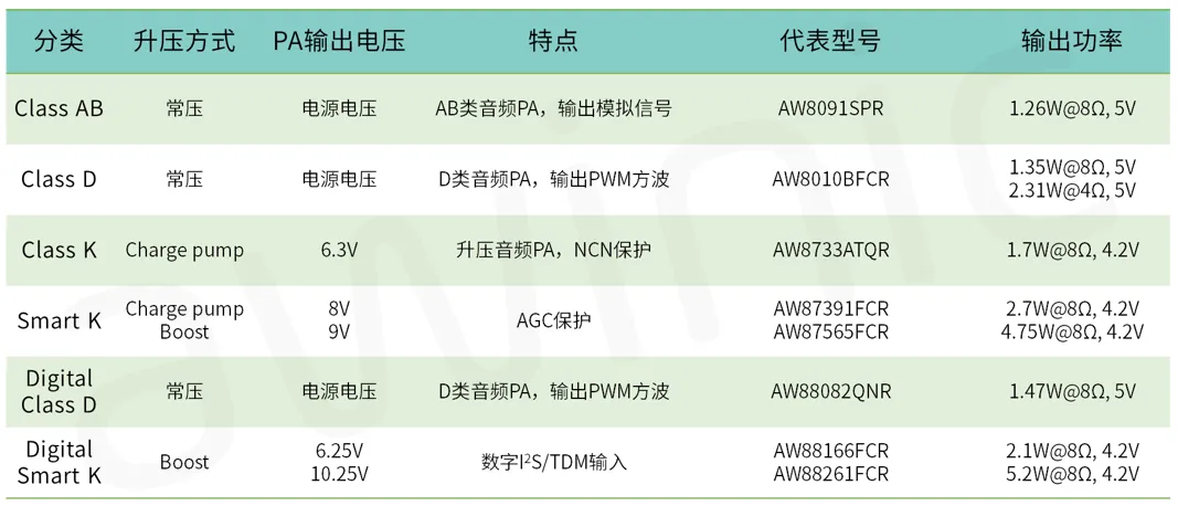 艾为全系列音频功放,覆盖模拟、数字接口、1W~5W输出功率,适配各种应用场景需求。