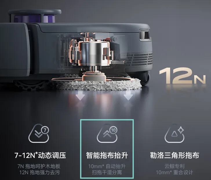 智能化扫地机器人需要应对不同清洁场景,例如用户只扫不拖的清洁需求、遇到地毯场景等,都需要将拖布进行抬升。另外,为应对墙角踢脚线等传统清洁难点,新一代扫地机器人普遍都会配备带升、降功能的边刷或滚刷,识别到墙角清洁时自动放下,显著提升清洁覆盖率。