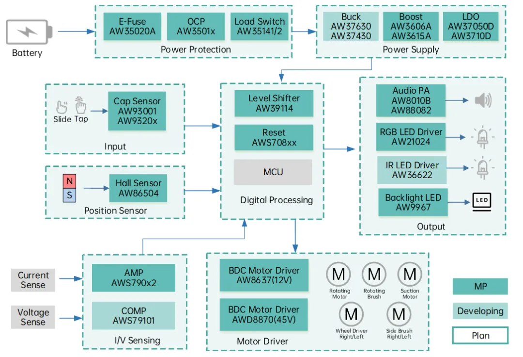 扫地机器人市场的蓬勃发展带来了方案和体验的不断更新,艾为电子基于人机交互、智能检测、马达驱动和通用器件四大应用场景推出相应的产品组合方案,为品牌和用户提供便捷、可靠的使用体验。