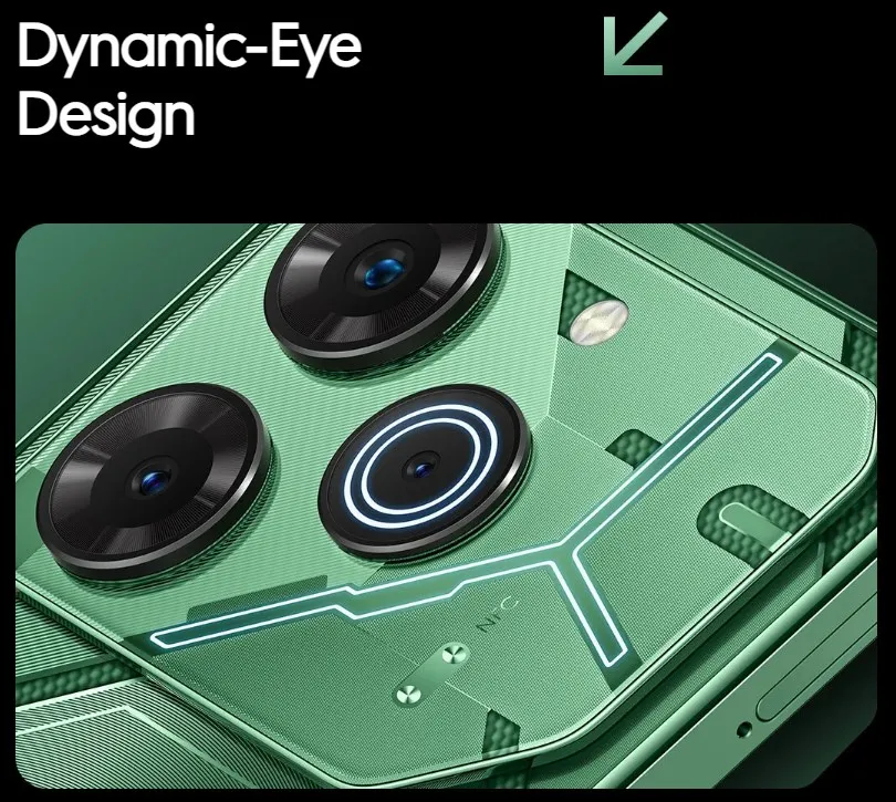 2024年传音控股旗下品牌Tecno新发布的POVA 6 Pro,搭配Dynamic-Eye镜头模组,其中一颗摄像头附有两圈LED灯环,采用艾为呼吸灯驱动芯片,单点控制210颗超微型迷你LED灯珠,实现灵眸般的光效。