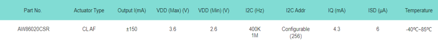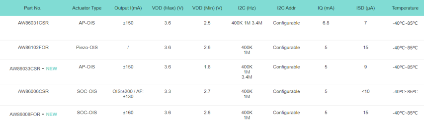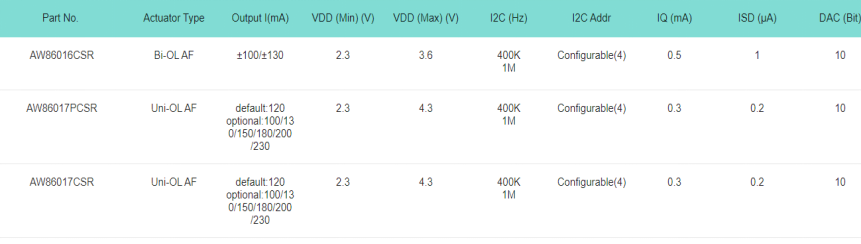 表1 艾为自动对焦&光学防抖产品选型表