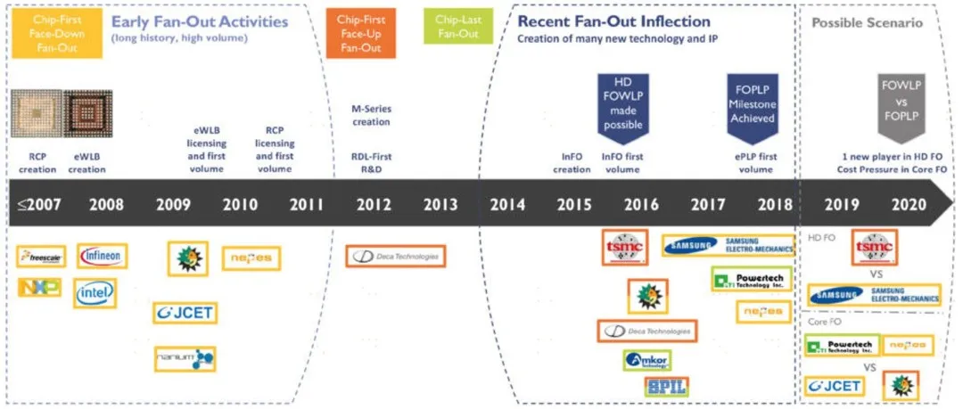 飞思卡尔于2006年左右推出重分布封装(Reconstituted Chip Package: RCP),英飞凌于2007年左右推出嵌入式晶圆级BGA(Embedded Wafer Level BGA : eWLB)。