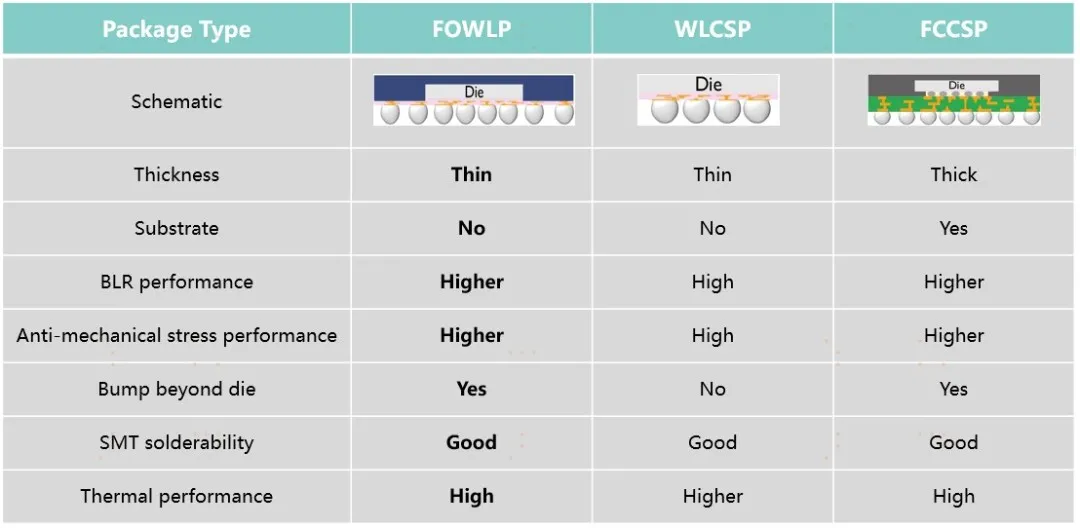 目前业内主流封装厂以及TSMC都基于不同的技术特点开发出各自的FOWLP技术,如下图所示。艾为基于自身产品的特点以及封装厂的技术优势,很早就已经开始关注FOWLP技术,并已经开始在一些产品上采用部分封装厂的FOWLP技术,艾为目前采用FOWLP封装技术的产品主要应用在电压转换器、音频功率放大器、负载开关等。