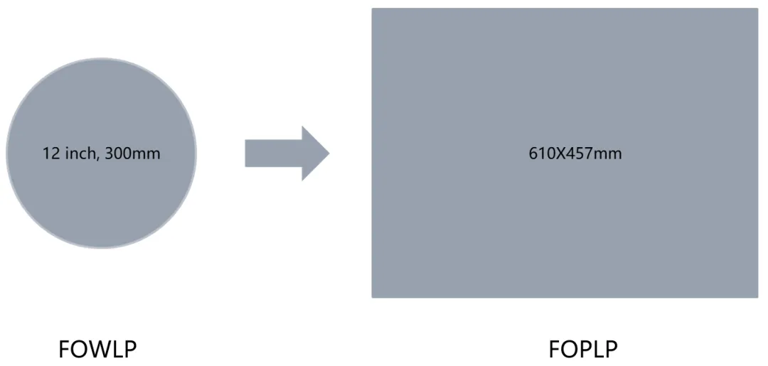 FOPLP封装流程与FOWLP类似,重组载板由8寸/12寸wafer carrier转换为大尺寸面板,以610mmX457mm尺寸面板为例,面积为12寸wafer carrier的3.9倍,单片产出数量为FOWLP的3.9倍,成本优势较大。