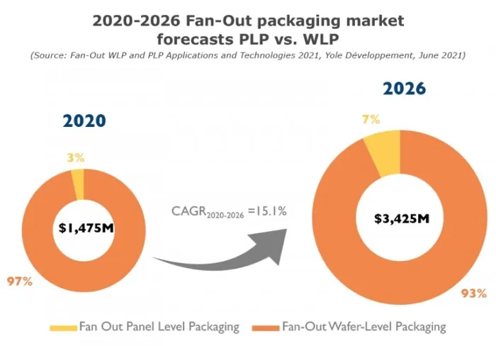 根据Yole对FOWLP以及FOPLP市场预测,FOWLP目前仍为扇出型(Fan-Out)封装主流,FOPLP正处于平稳增长阶段,预计市场占有率将由2020年的3%提升至2026年的7%。
