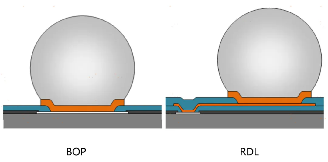 常见的Fan-In(WLCSP)通常可以分为BOP(Bump On Pad)和RDL(Redistribution Layer)。BOP封装结构简单,Bump直接生长在Al pad上;如果Bump位置远离Al pad,则需要通过RDL将Al pad与Bump相连。