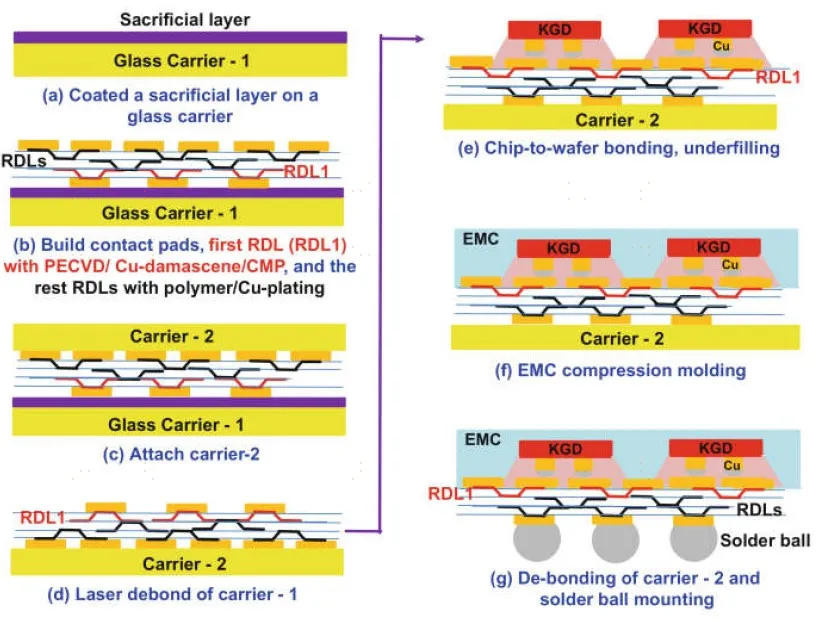 (1)芯片只会在合格的RDL上倒装芯片,可避免芯片损失,适用于高价格的高端芯片;