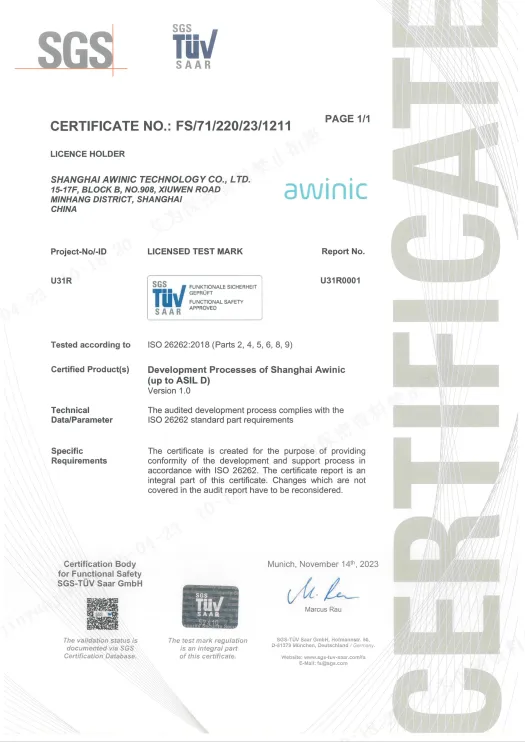 2023年,艾为成功获得了由国际权威的测试、检验和认证机构SGS颁发的ISO 26262:2018汽车功能安全最高等级ASIL D流程认证证书。这一证书的获得,标志着艾为已按照 ISO 26262:2018 标准的严格要求,建立起了一套完全符合汽车功能安全最高等级 ASIL D 级别的产品开发和管理流程体系。这不仅表明艾为在汽车功能安全的开发与管理能力方面达到了国际领先水平,更充分体现了艾为在车规芯片领域具备高标准、高质量的研发和交付能力。