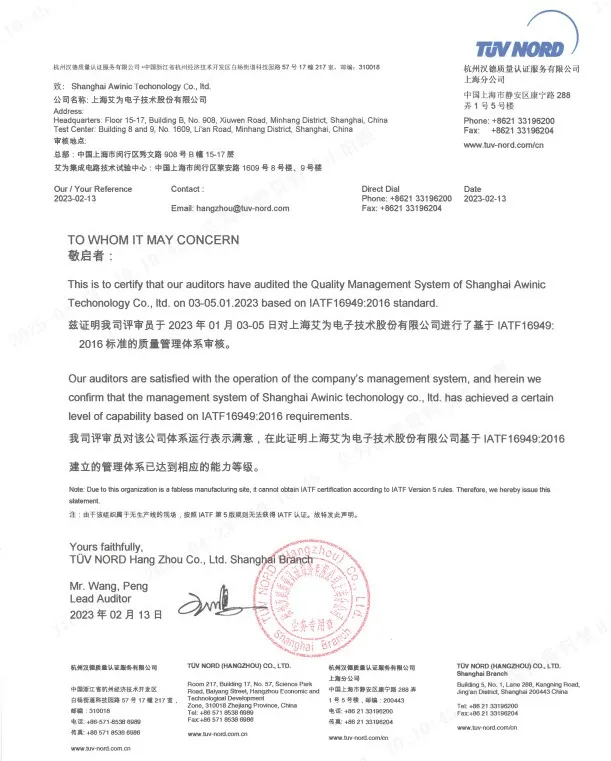 2023年,艾为电子成功通过了国际车载领域的权威认证 —— 德国TUV NORD公司的审核认证,获得 IATF16949:2016质量管理体系符合性声明证书。这一成果标志着艾为在车规产品全流程质量管理体系的建设方面,完全符合汽车质量体系的严格要求,也意味着艾为芯拿到了进入汽车市场领域的 “通行证”。