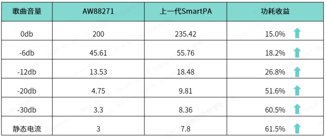 AW88271CSR采用全新低功耗技术,在不同音量场景下均能实现效率提升:中小信号场景效率提升10% 以上,大音量场景效率提升约5%,有效降低了芯片功耗。不同音量下的具体功耗收益如下表所示。