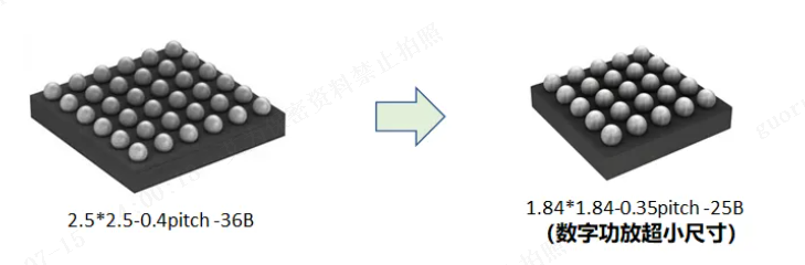 AW88271CSR创新性地采用0.35mm引脚间距设计,进一步缩小了芯片尺寸,单颗芯片尺寸仅为1.84mm×1.84mm;相较于上一代产品AW88261FOR,其芯片面积缩减46%。