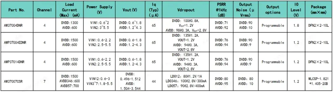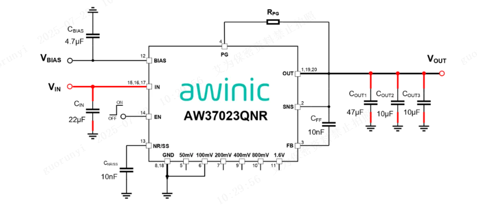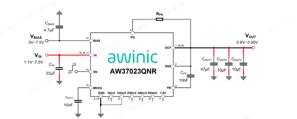 在5G基站射频前端与交换机串行解码链路等对噪声敏感的应用中,电源噪声可能直接转化为信号干扰。AW37023QNR的超低噪声技术,可实现5μVrms(10Hz-100kHz,0.8V/3A)超低噪声性能,确保ADC采样精度、PLL时钟稳定性及高速串行链路误码率(BER)指标。