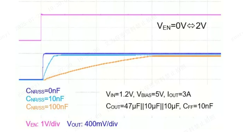可调节软启动输出:通过在NR/SS引脚外接不同CNR/SS电容来设定VOUT软启动时间。