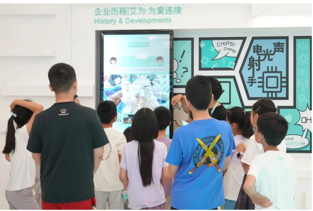 来到创芯馆【一粒沙的智慧之旅】展区,芯片的发展历程、制作过程、设计理念与应用场景依次呈现。【360度环幕影厅】则带领同学们沉浸式感受艾为芯带来的美好生活体验。生活中,凡是眼睛看到的、耳朵听到的、手能触摸到,甚至触摸不到的,都可能有一颗艾为芯。展厅内,搭载着 “awinic inside” 的声、光、电、射、手五大产品线终端产品错落陈列,更让同学们惊叹不已 —— 原来艾为芯早已悄然融入生活的方方面面。