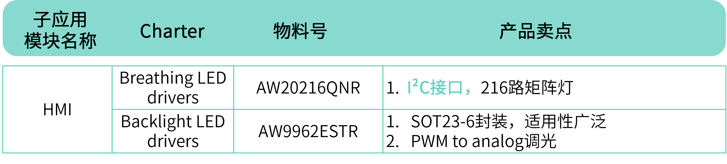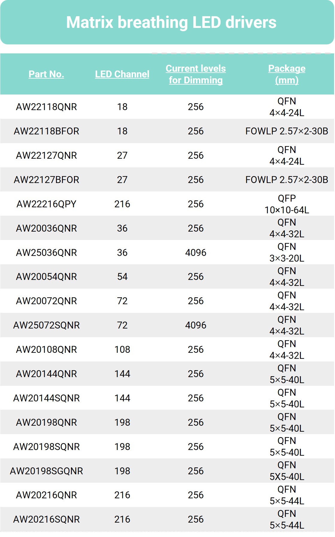 矩阵型呼吸灯驱动产品选型表: