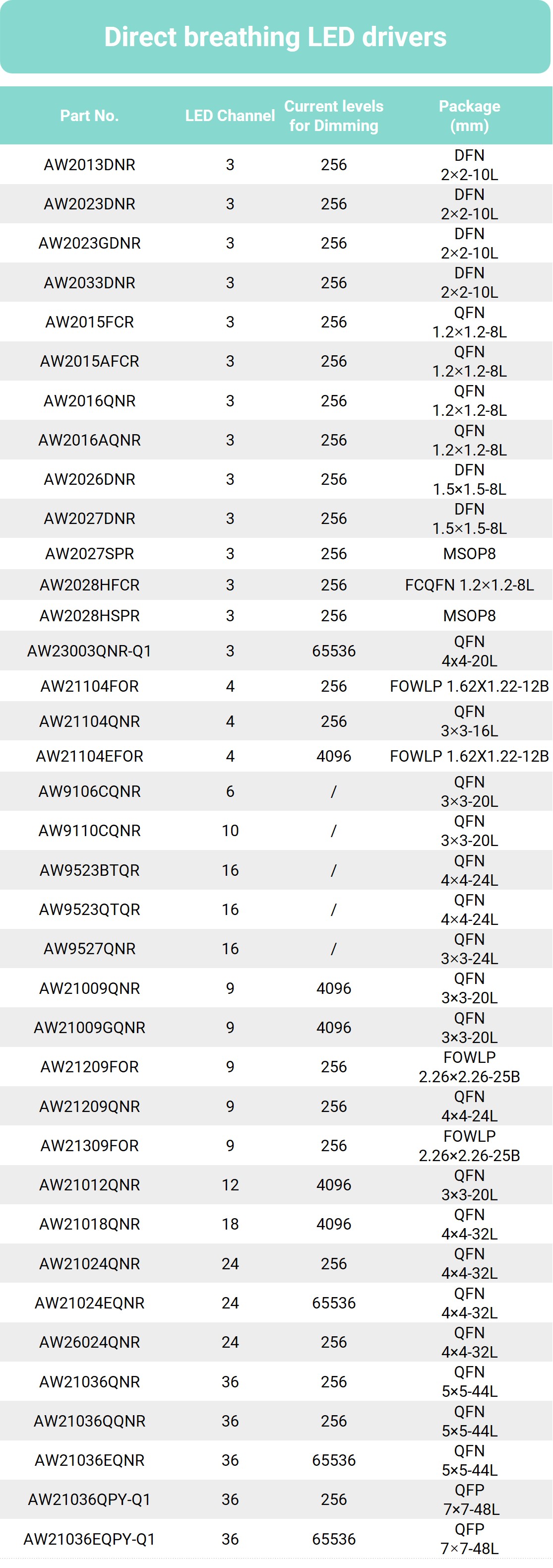 直驱型呼吸灯驱动产品选型表: