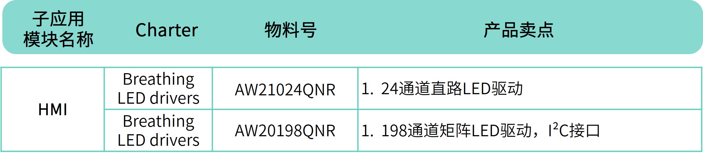 矩阵型呼吸灯驱动产品选型表: