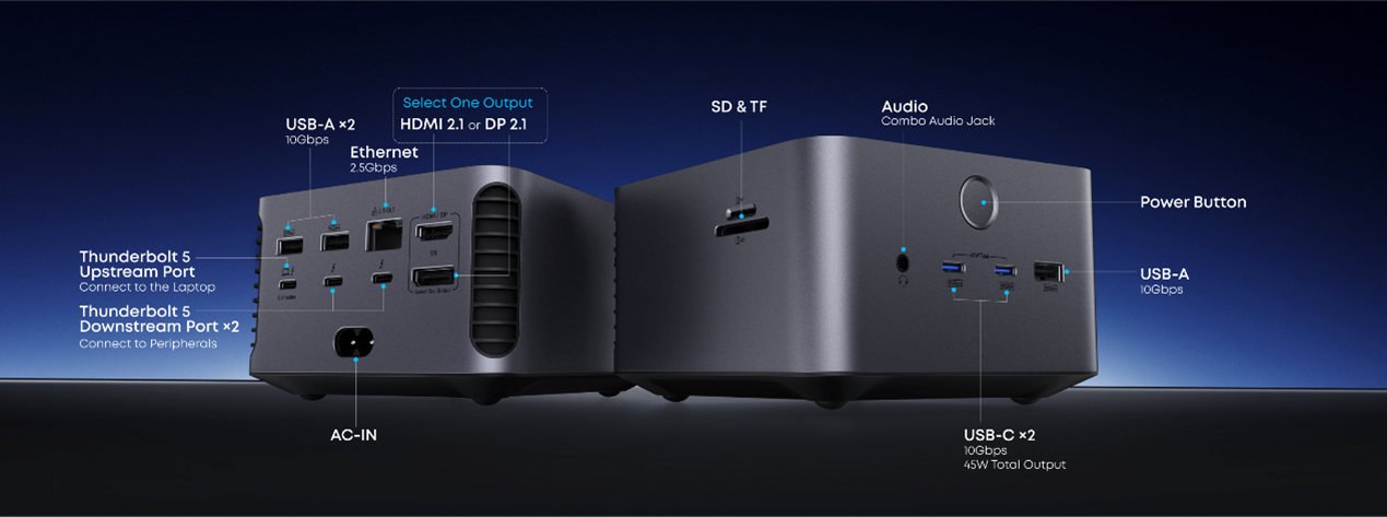接口布局上,前方常用口支持45W双C快充、音频及USB-A,即插即用超顺手;后方集结雷电5、2.5G网口、HDMI、DP等,线材隐藏不杂乱;