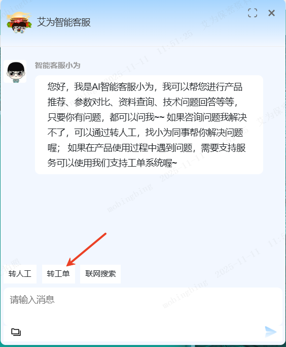 方式2. 登录艾为官网 → 点击【智能客服小为】 → 【转工单】,也可以进入工单系统