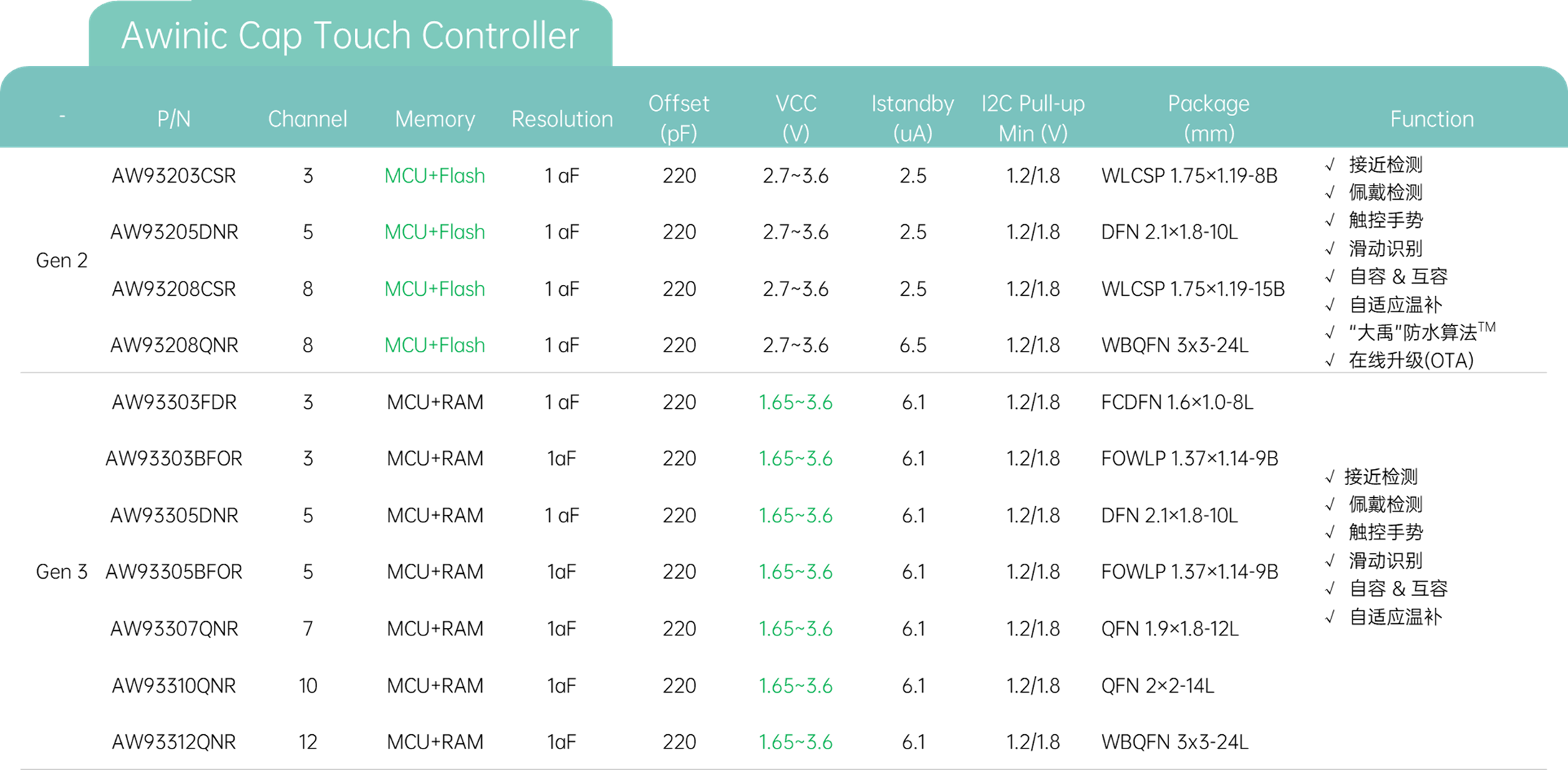 3~12通道触控SoC系列化布局,涵盖超小封装和大尺寸封装,触控手势识别、佩戴检测、人体接近检测等量产案例丰富,可满足不同应用场景需求。其中5通道超小封装产品AW93305BFOR 的占板面积仅1.56mm2,相比常见的DFN 2.1mm * 1.8mm 封装占板面积小了58.7%;