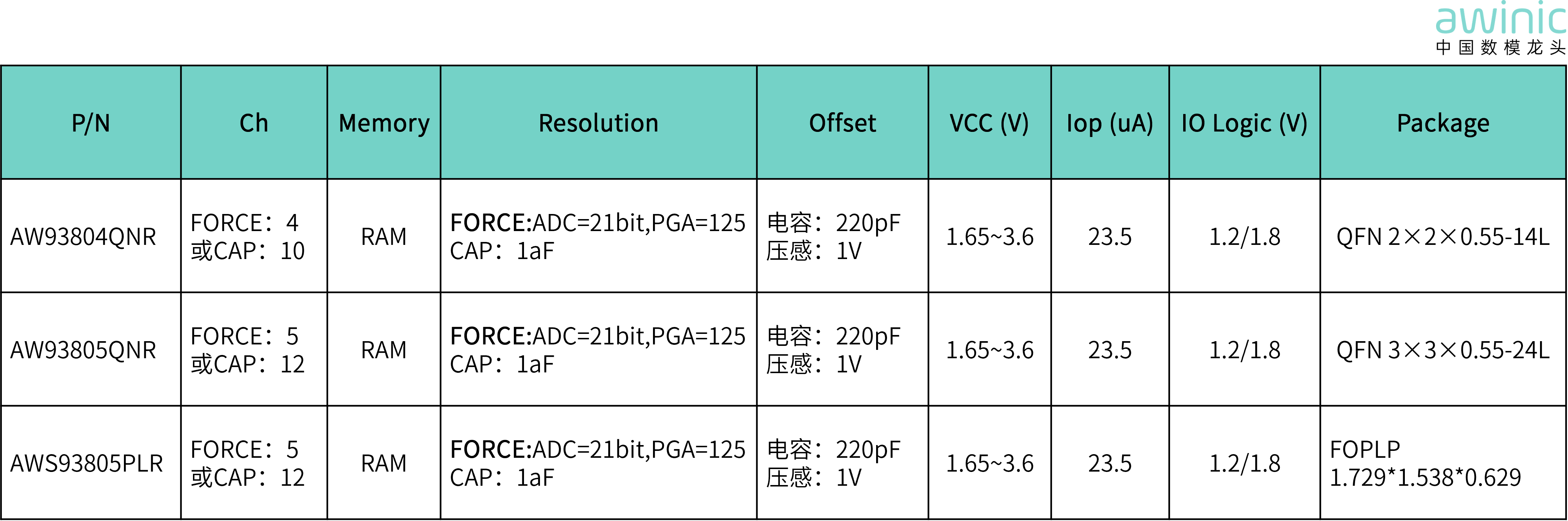 产品应用面临需要同时使用force和cap应用场景时,往往会采用多个独立芯片完成不同功能,或针对单一功能需要协同工作实现,集成式芯片封装优势可以减少占板面积。例如AW93804QFN和AW93310QFN对比在封装一样的前提下迭代增加了电阻式压感模组的检测应用。
