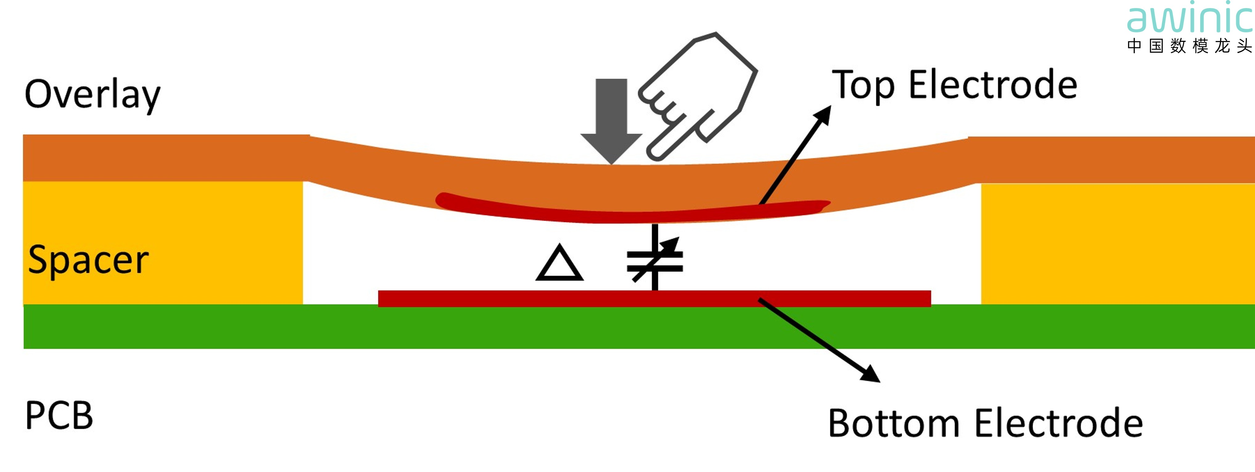 【工作原理】根据平行板电容原理,手按压时电容两个电极之间的间距变小,电容会增大;