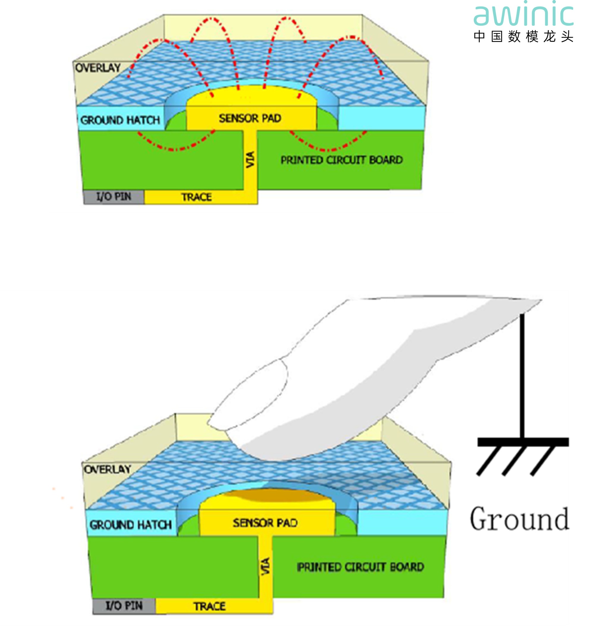 为电容检测芯片外接滑动感应电极即可实现滑动和Touch功能,根据不同的PAD设计,可实现上/下/左/右滑动事件上报。