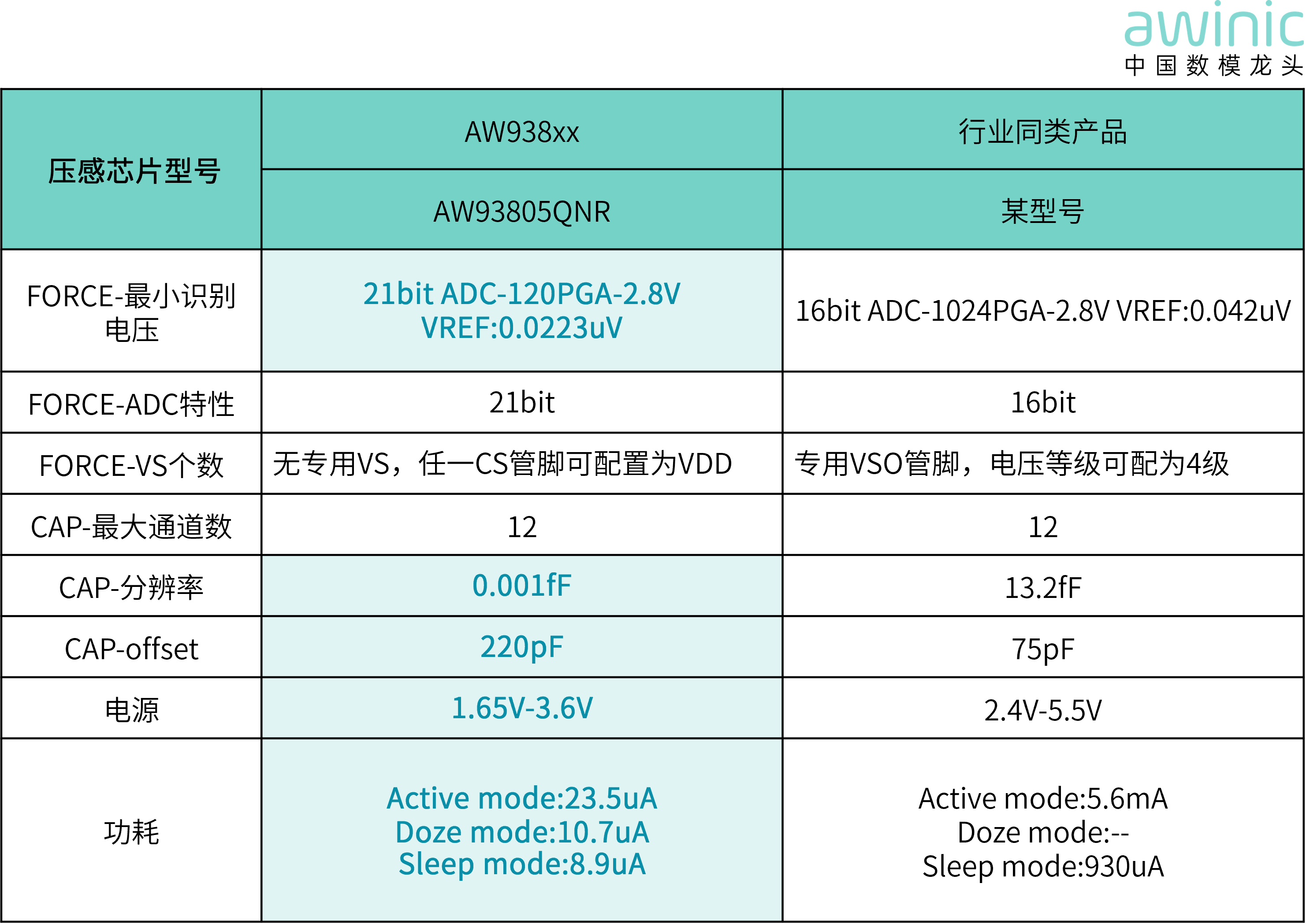 数模龙头艾为电子推出的AW938XX系列最多覆盖5通道电阻式压感应用/6通道电容式压感应用,具备21Bit高精度ADC ,支持多级按压识别,单击/双击、长按/短按检测。覆盖 12 通道电容触控应用,具有 1aF 电容检测精度,能自动抵消 220pF 以内的负载电容,可实现触摸按键、触控滑条等功能以及适配多种压感+电容组合使用场景。