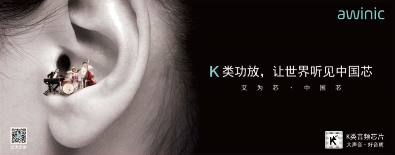 大篇幅的人耳和不同乐器组成的乐队,用突出特征的手法,合理夸大地表现了艾为K类音频功放产品大声音、好音质的特点。直观震撼的视觉效果、简单大气的文字运用,不仅仅展现了艾为K类音频功放产品在市场上的优势和特色,更用震撼视角描绘“中国芯·艾为芯”新未来,诠释了艾为不断创新、勇于突破,用自己的产品和实力为高品质中国芯“发声”的决心。
