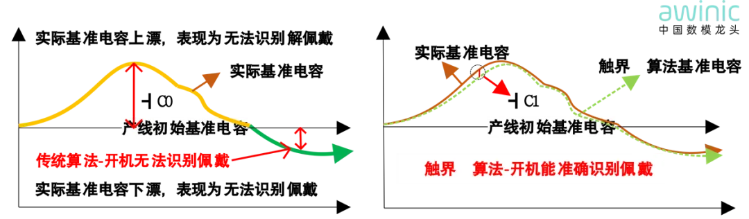 *在开机佩戴应用中,与实际基准电容的偏差越小,开机佩戴的成功率就越高。“触界”算法估计的基准电容与实际基准电容的偏差△C1远远小于初始基准电容与实际基准电容的偏差△C0。极大地提高了开机佩戴的成功率。