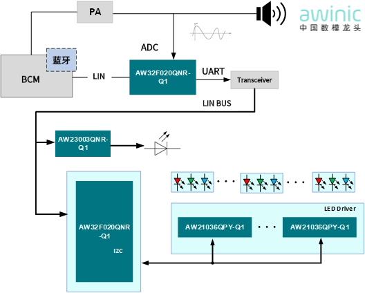 支持LIN通讯,支持多颗 LED Driver 组合显示,AW21036QPY-Q1单芯片支持驱动12颗RGB,单个I2C总线可支持48颗RGB灯珠,每颗LED最大支持50mA驱动电流,总体方案低EMI、无啸叫;提供声光律动算法,温度补偿,颜色校准算法。