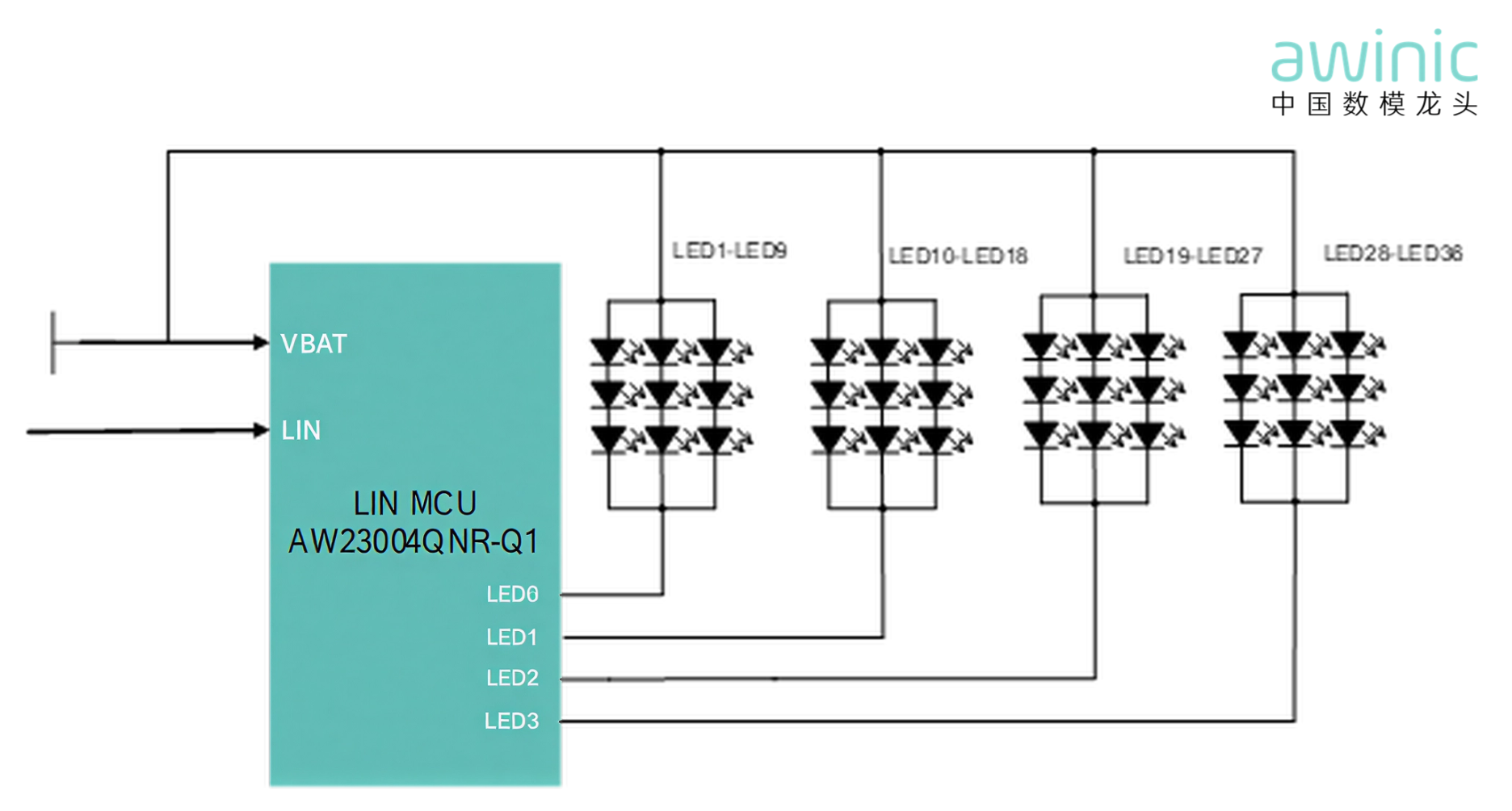艾为针对上述场景推出专属适配方案,采用AW23004QNR-Q1芯片,单路最大驱动能力为60mA,在12V供电场景下可串联3颗LED(可根据LED正向节压动态调整);采用“3串3并”拓扑结构,串联设计确保电流一致性,并联设计实现电流分流,使单颗LED工作电流稳定在20mA,兼顾亮度与功耗的平衡。