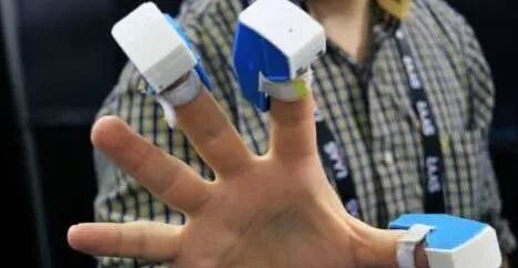 一款名叫Go Touch VR的触觉反馈装置,原理也很简单。让用户指套上指尖后,它利用了一个微型马达和可以前后移动的塑料片。马达压迫塑料片,可以带给指尖压迫感,来模拟按到了一个平面的感觉,适合按按钮、点、戳、抓握等简单动作。