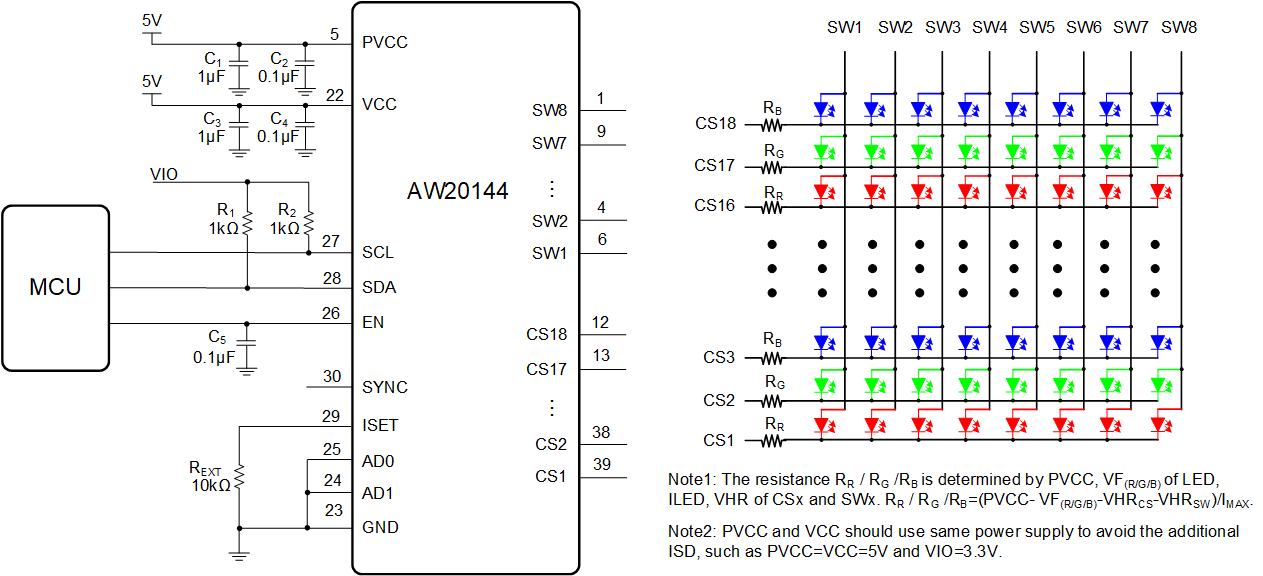 AW20144 is an 18x8 matrix LED driver programmed via an I2C compatible interface. Each channel has individual 8-bit DC current setting for color-mixing and 8-bit PWM current setting for brightness control. The global current of each channel is configured via register GCCR and external resistor REXT.