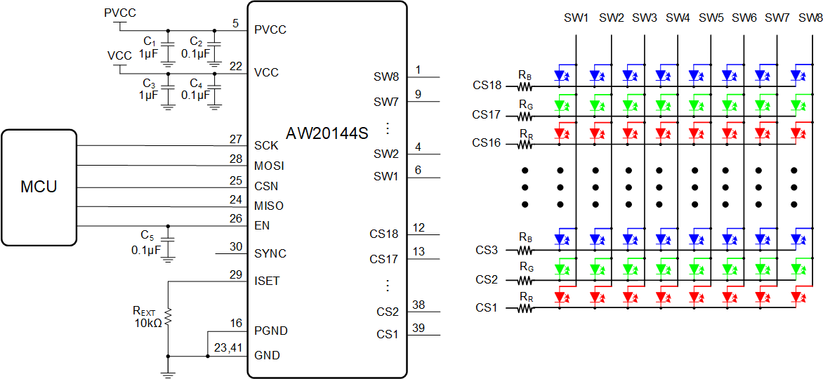 AW20144S is an 18x8 matrix LED driver programmed via an SPI compatible interface. Each channel has individual 8-bit DC current setting for color-mixing and 8-bit PWM current setting for brightness control. The global current of each channel is configured via register GCCR and external resistor REXT.