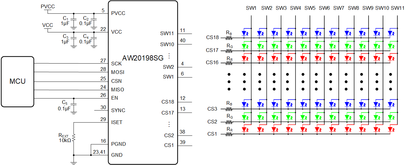 AW20198SG is an 18x11 matrix LED driver programmed via an SPI compatible interface. Each channel has individual 8-bit DC current setting for color-mixing and 8-bit PWM current setting for brightness control. The global current of each channel is configured via register GCCR and external resistor REXT.