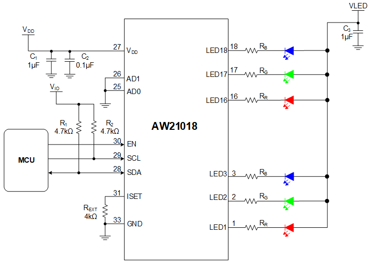 AW21018 is an 18-channel multi-function LED driver. Each channel has individual 8-bit DC current setting for color-mixing and maximum 12-bit PWM resolution for brightness control. The global current of each channel is recommended to be 40mA configured via register and external resistor REXT.