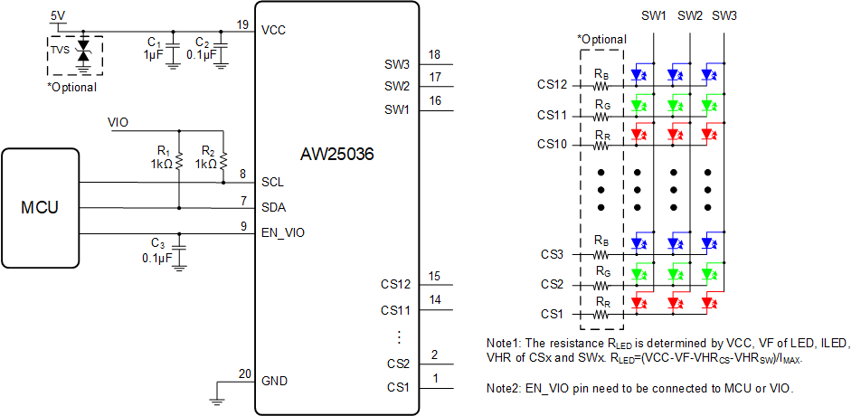 AW25036 is a universal high-performance LED driver IC designed to drive up to an 12×3 LED matrix.